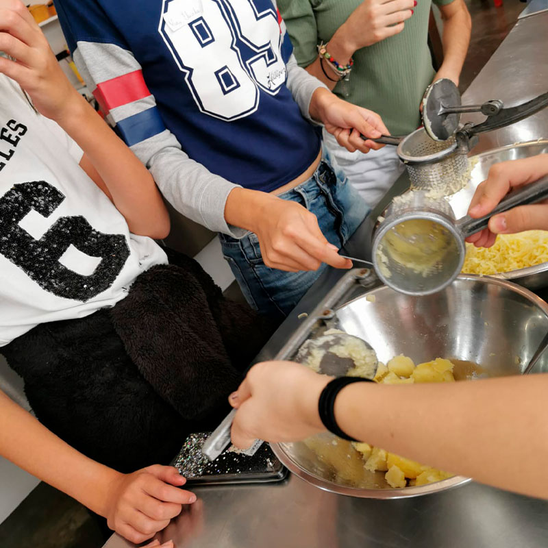 Meninas e meninos fazem todos os preparos, passo a passo, na escola e depois almoçam.
