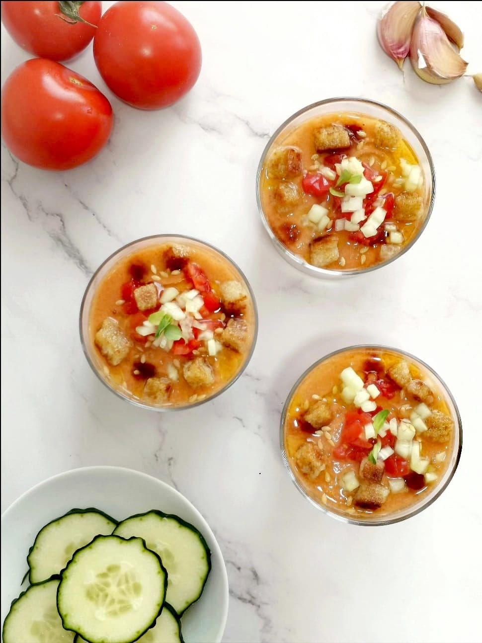 Sopa símbolo do verão espanhol servida fria, feita com tomate, pão, azeite e vinagre.
