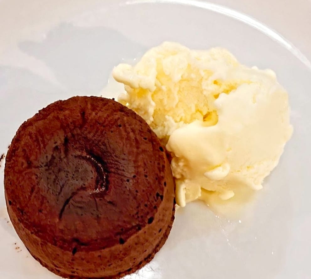 Bolinho de chocolate com interior cremoso que escorre ao cortar.